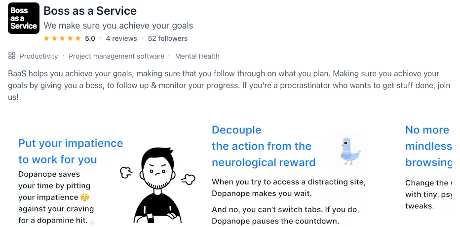 BossAsAService takes a different angle. Your "boss" checks in daily to make sure you did what you said you'd do. The tone is deliberately more direct - less coaching, more management. You tell them your plan, they follow up. Simple.