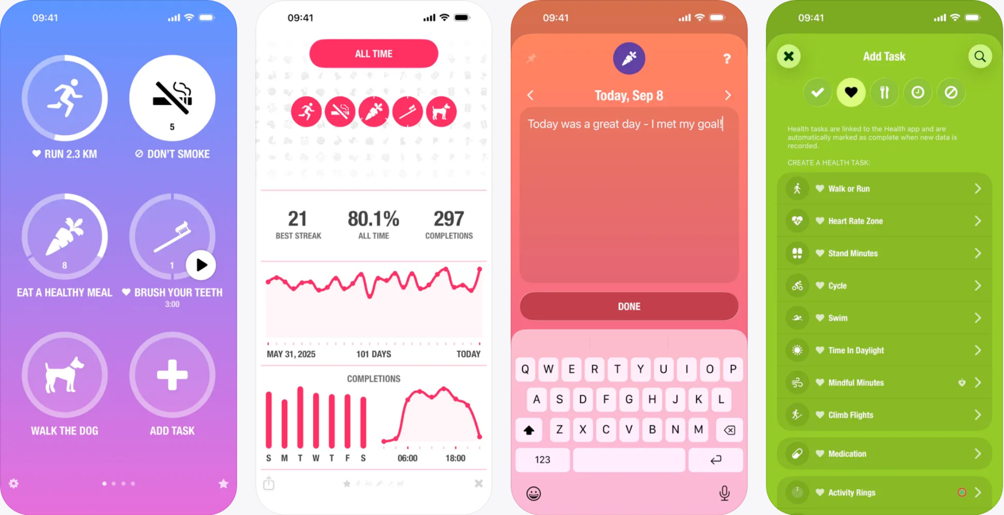 Streaks tracks up to 24 habits with a gorgeous interface and integrates with Apple Health to automatically log exercise, sleep, and meditation. One-time purchase, no subscription.